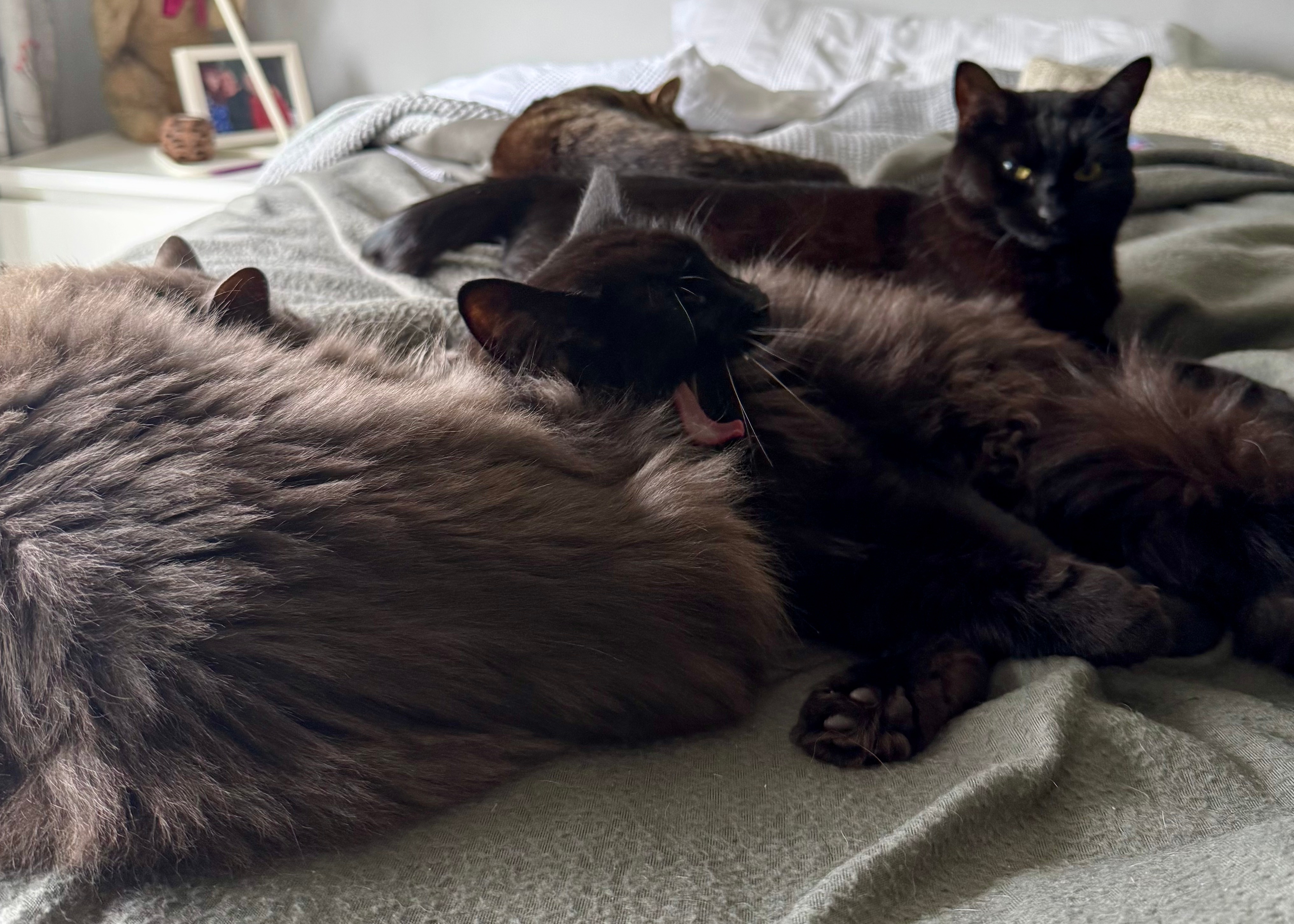I found all four of the cats curled up on my Mum’s bed, chilling out out of reach of the dogs. It’s so sweet that they like to hang out together, in various states of closeness, and it takes great restraint not to disturb them and wait for another moment to sweep one (or many) of them up for a cuddle. It still feels weird and wrong without Lucy – and I can’t look at them, her descendants, and not miss her – but I’m so relieved that they’re all still so close and that none of them seem to be exhibiting ongoing signs of distress from the loss of Lucy. I don’t know how cats grieve – because apparently they do – and they very clearly missed Lucy desperately early on but I am glad that it hasn’t traumatised them. It’s traumatised me but it’s obviously really important to me that they’re healthy and happy and feel safe and, as far as we can all tell, they are all of these things.
